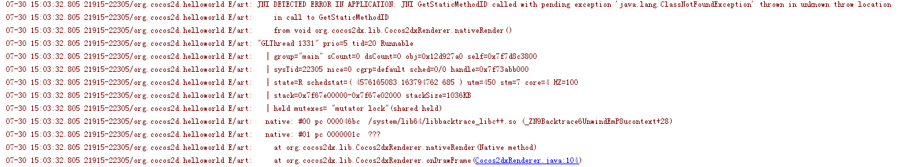 08-01 14:33:43.164 9081-9465/org.cocos2d.clientV2_HZMJ_NEW E/art: JNI DETECTED ERROR IN APPLICATION: JNI GetStaticMethodID called with pending exception ‘java.lang.ClassNotFoundException’ thrown in unknown throw location