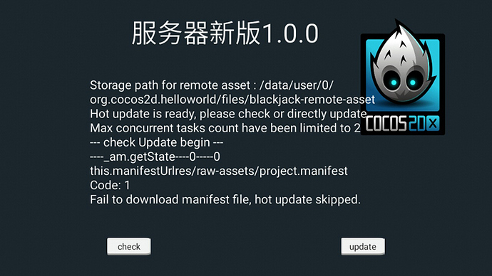 事情大概是这个样子。模仿官网热更新例子(抄了一个)。在windows 平台上调试,可以成功更新,打包成apk 之后,部分手机(两年前的老手机 android 5.0) 成功更新。新手机(android 6.0+ 魅族5S,小米,神机乐视)下载失败。代码如下,求大神指点。