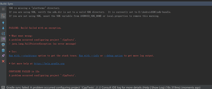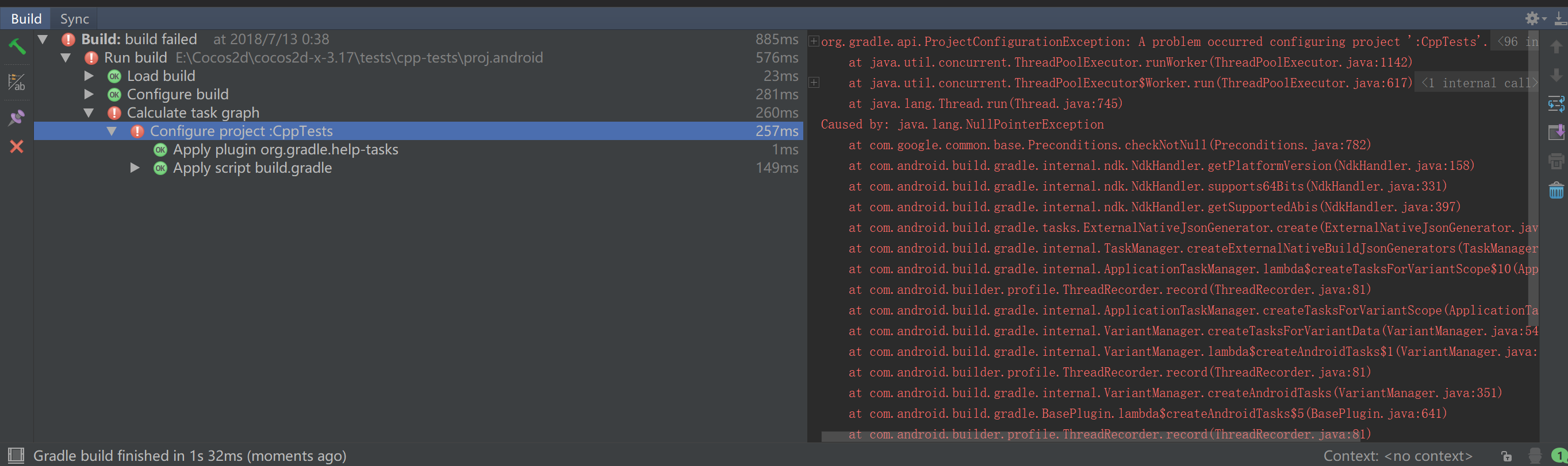 如题,我按照官网给的文档http://docs.cocos.com/cocos2d-x/manual/zh/installation/Android-Studio.html 搭建环境,但是遇到了这个错误(stacktrace)