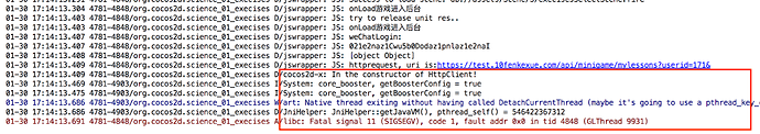 01-30 16:37:37.014 31030-31131/org.cocos2d.science_01_execises W/art: Native thread exiting without having called DetachCurrentThread (maybe it’s going to use a pthread_key_create destructor?): Thread[17,tid=31131,Native,Thread*=0x558ee648f0,peer=0x12c5e0a0,“Thread-9907”]