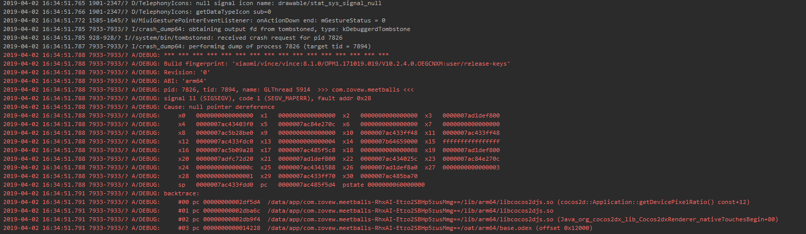 2019-04-02 16:34:51.791 7933-7933/? A/DEBUG: #02 pc 00000000002db9f4 /data/app/com.zovew.meetballs-RhxAI-Etzo2SBHp5zusMmg==/lib/arm64/libcocos2djs.so (Java_org_cocos2dx_lib_Cocos2dxRenderer_nativeTouchesBegin+80)