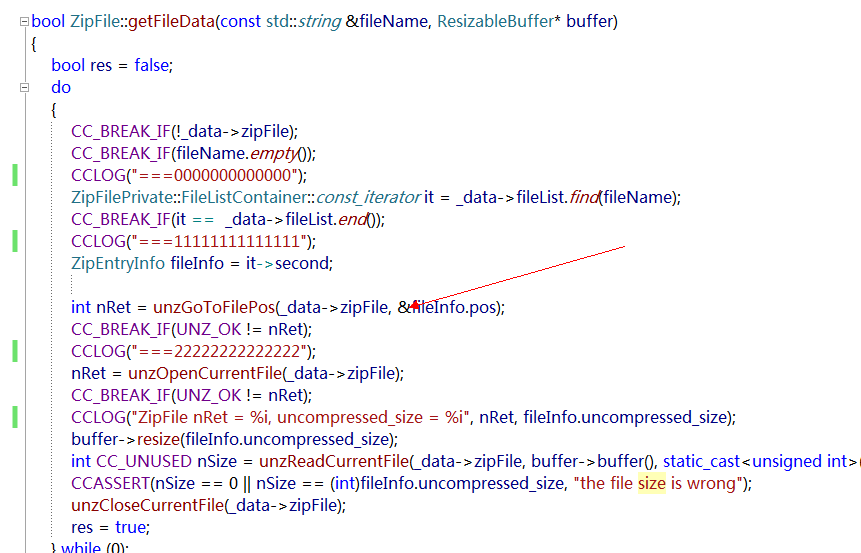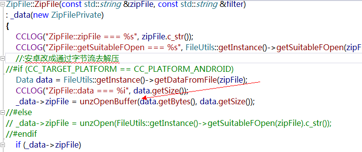 图片资源用zip压缩成一个res.zip(即apk包的assets中包含一个res.zip),然后如果要获取资源数据,就去zip包中获取,可是安卓平台下无法获取res.zip的绝对路径,只能获取到二进制数据流,所以修改了ZipFile解析zip的代码,见图一;根据打印结果,能够正确解析出里面的文件名和大小,可是当我从zip中获取某个文件的数据的时候(见图二),就获取不到了;然后我就跟踪了图二中那标红的那个方法unzGoToFilePos(),一直到图三那个方法,直接返回错的结果了,不清楚是什么原因,大家能帮忙看看吗?或者有另外的解决方案吗?