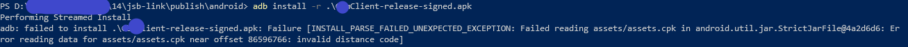 adb: failed to install .\GGGClient-release.apk: Failure [INSTALL_PARSE_FAILED_UNEXPECTED_EXCEPTION: Failed reading assets/assets.cpk in android.util.jar.StrictJarFile@82bf5f9: META-INF/MANIFEST.MF has invalid digest for assets/assets.cpk in assets/assets.cpk]