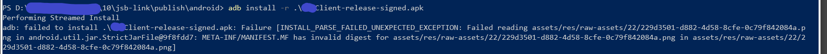 adb: failed to install .\GGGClient-release-signed.apk: Failure [INSTALL_PARSE_FAILED_UNEXPECTED_EXCEPTION: Failed reading assets/res/raw-assets/e3/e37887ang in android.util.jar.StrictJarFile@b76a19a: META-INF/MANIFEST.MF has invalid digest for assets/res/raw-assets/e3/e37887ad-5de9-4a8a-ac6a-3c8b9904f5b2.pn37887ad-5de9-4a8a-ac6a-3c8b9904f5b2.png]