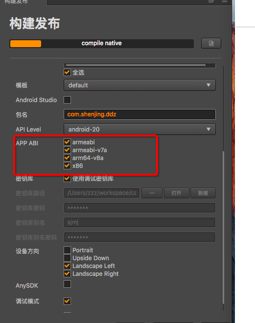 需要根据自己的项目实际情况决定要编译哪些 APP ABI。如果都不勾选的话,那么默认与 proj.android/jni/Application.mk 中 APP_ABI 的值一致(Android Studio 项目的话,是 proj.android-studio/app/jni/Applicaition.mk 文件)