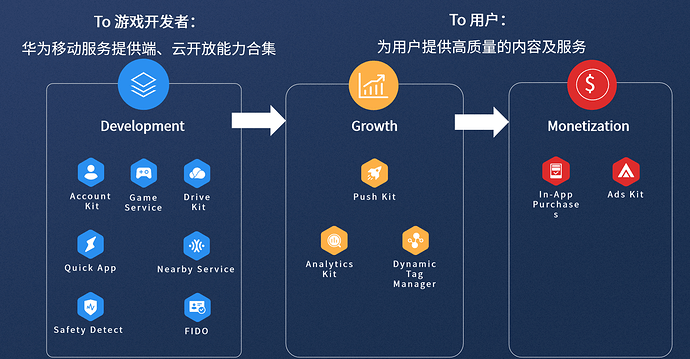 HMS Core 是用来连接开发者和用户的一个桥梁,主要包括下图的三个部分:开发、增长、变现,每个部分下面都有各种可接入的 Kit 和 API。