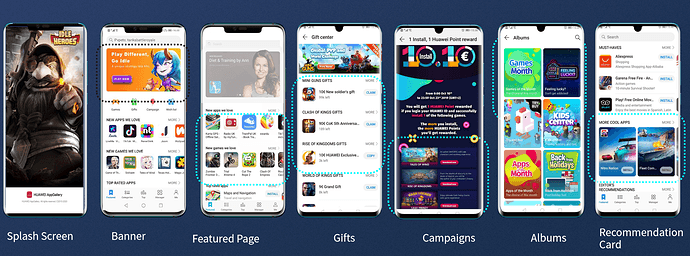 AppGallery为 开发者提供丰富的扶持资源,包括应用市场资源、手机资源、本地营销资源、联运支持以及收入分成。其中,华为应用市场站内可用资源包括 Splash Screen、banner、Featured Page、Gifts、Campaigns、Albums 以及Recommendation Card。