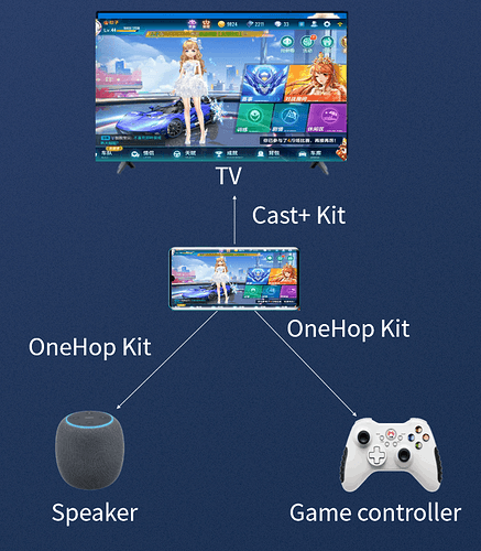 使用 Cast+ Kit 和 OneHop Kit 可以将手机作为一个 Hub,连接华为生态的其他硬件产品,比如电视、音箱以及游戏控制器。并且可以做到低延迟、防丢包、更长的电池寿命以及一触即连(NFC)。开发者通过使用这两个 Kit,可以开发出更具吸引力的功能。