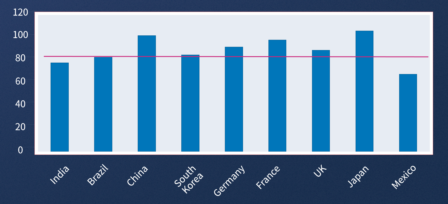 首先来看一些数据:所有的安卓应用商店总共已经有 290w+ 的 App,每天都有 6000 新 App 发布,但是有 50% 的用户每月下载 App 的数量为 0。下图为每个国家平均每个手机安装的 App 数量,而这些国家的平均值为 80。