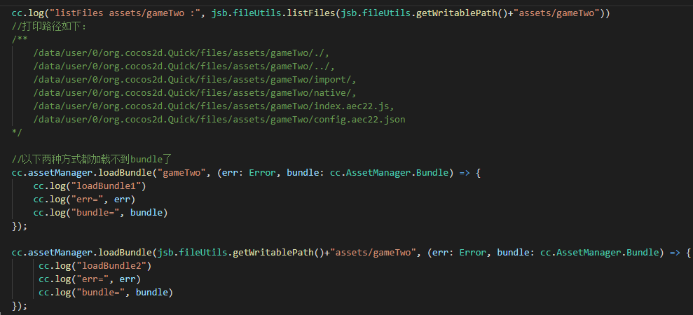 官网说v2.4.3可以支持加载存储空间里的bundle,可是v2.4.0第一次可以成功加载,且该加载的bundle也是位于存储空间(/data/user/0/org.cocos2d.Quick/files/assets/gameTwo/)