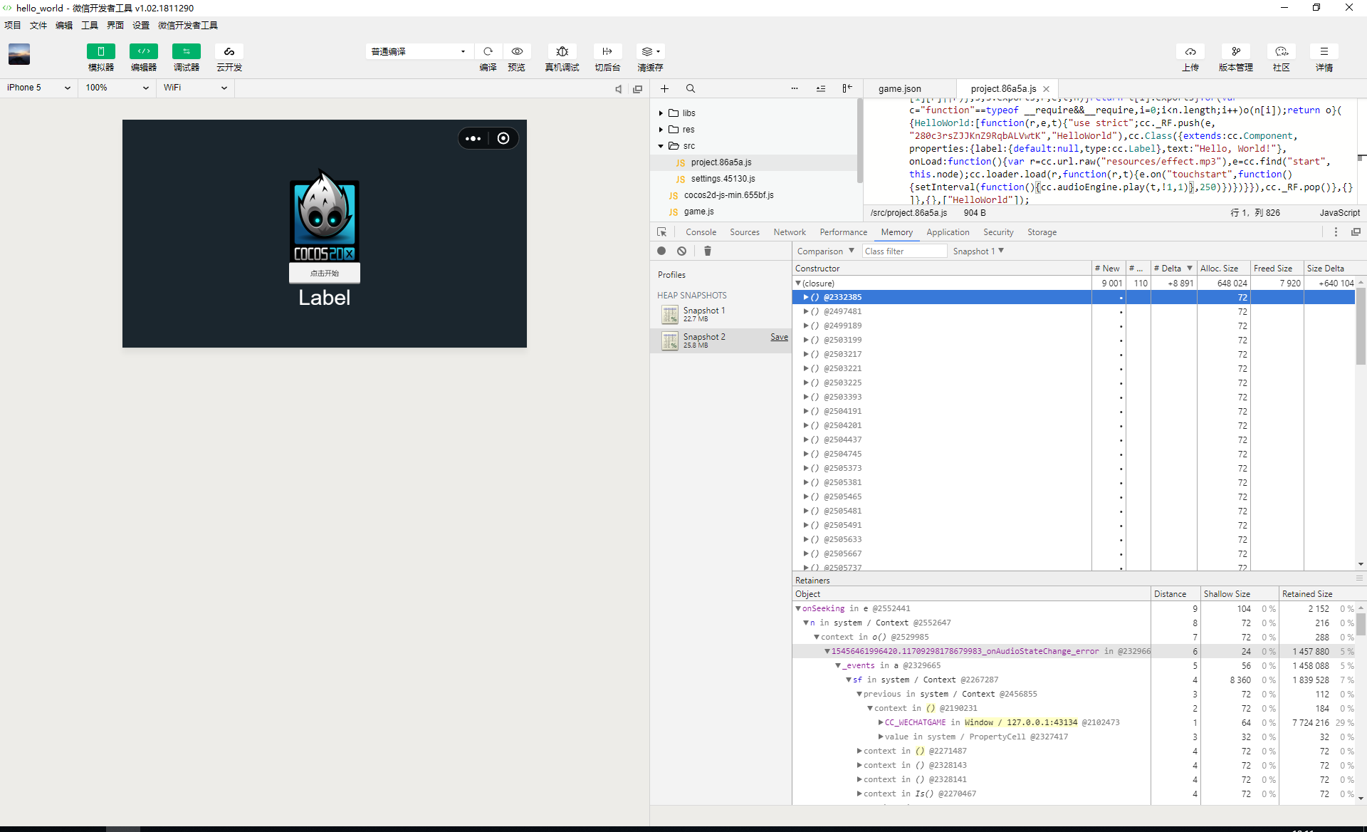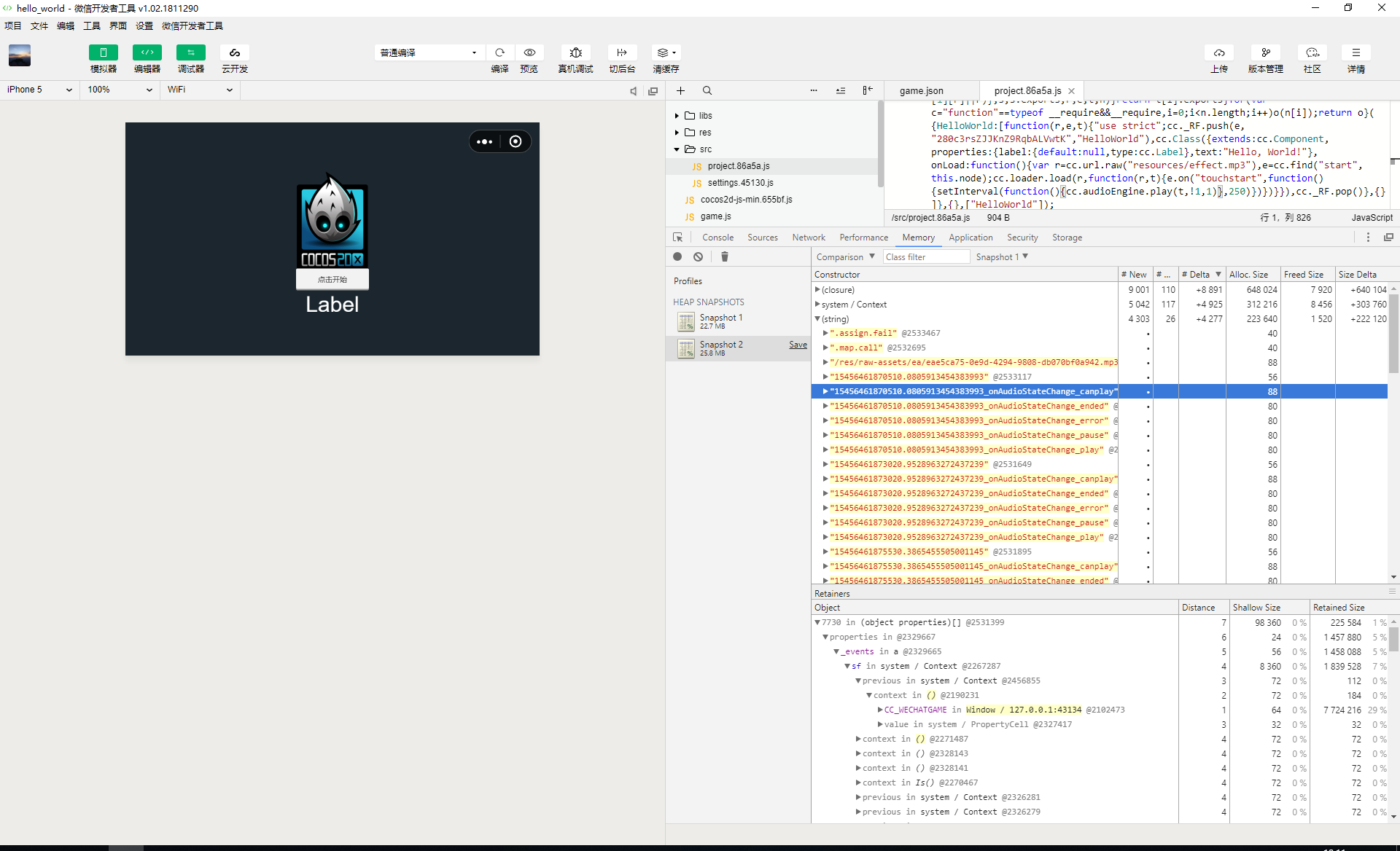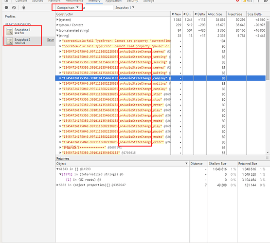 这边跟踪了下小游戏开发工具里的泄漏,发现每次播放音效都会造成内存泄漏
