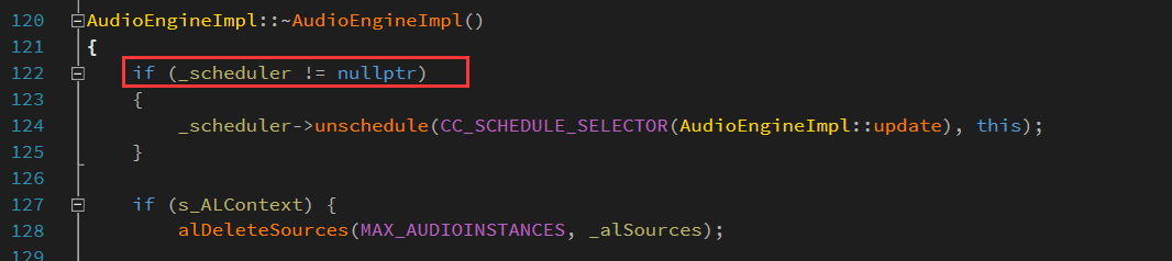 当关闭应用程序时首先会析构Director,此时_scheduler变成了一个野指针,如果上层再去释放AudioEngine时就会崩溃了。