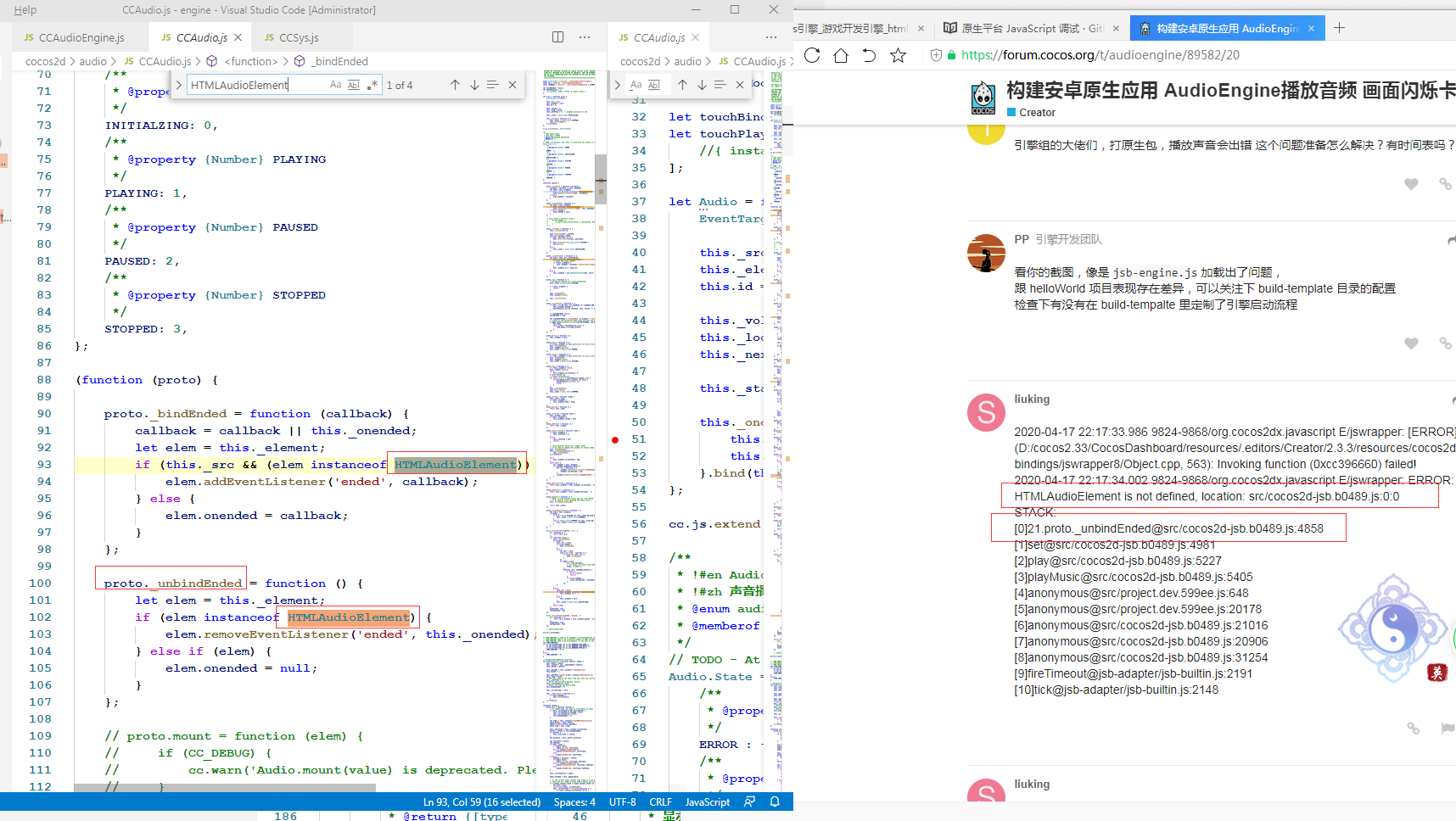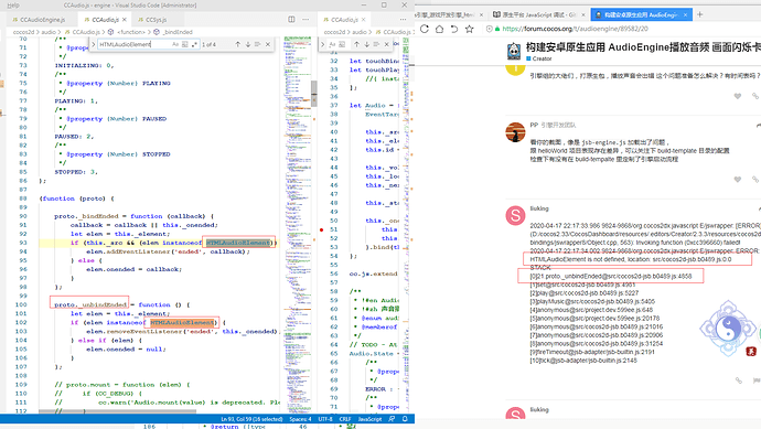 HTMLAudioElement 属于H5的标准,在安卓或者iOS下是不是不存在这个类。但是又挺奇怪的,在demo工程中播放声音都没有问题,就在正式游戏中打包会出现这个问题,将cc.audioEngine注释掉,手机闪屏就正常了,但是没得声音。求引擎组大神解惑