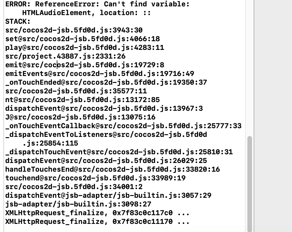 2020-04-17 22:17:34.002 9824-9868/org.cocos2dx.javascript E/jswrapper: ERROR: Uncaught ReferenceError: HTMLAudioElement is not defined, location: src/cocos2d-jsb.b0489.js:0:0