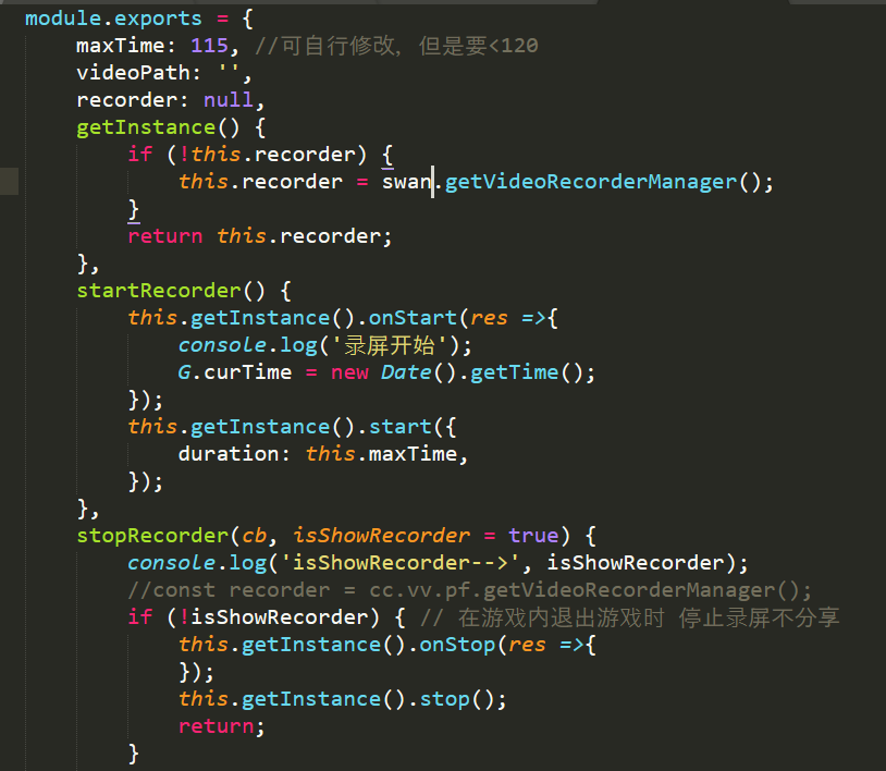 有一个问题:在A场景srartRecorder以后,进入B场景,调用stopRecorder(null, false)停止录屏,再回到A场景,调用startRecorder(上述过程都尝试过加一点延时),这个时候,就会有两个“录屏开始”,如果再重复上述过程就会有3个 4个。。。“录屏开始”,求问大佬们。。这个怎么搞。