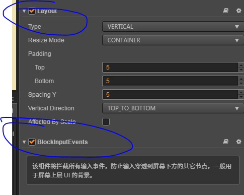BlockInputEvents 组件将拦截所属节点 bounding box 内的所有输入事件(鼠标和触摸),防止输入穿透到下层节点,一般用于上层 UI 的背景。