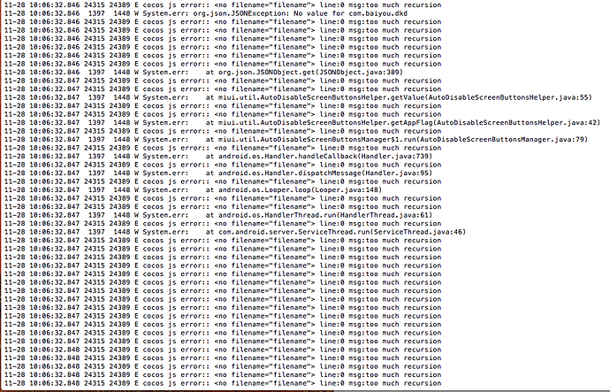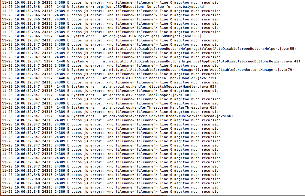 11-28 10:06:33.010 639 639 F DEBUG : #03 pc 0030a3fc /data/app/com.baiyou.dkd-1/lib/arm/libcocos2djs.so (_ZN13ScriptingCore11reportErrorEP9JSContextPKcP13JSErrorReport+160)
