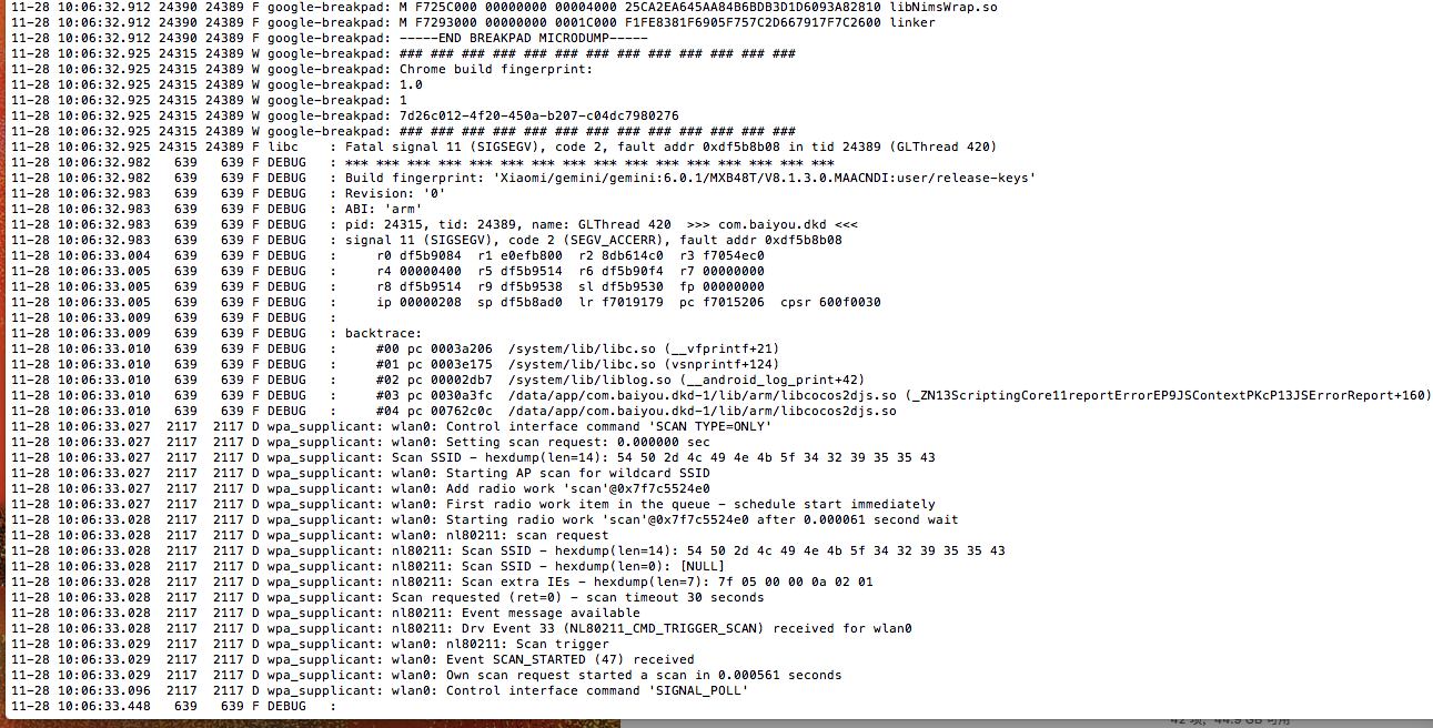 11-28 10:06:32.983 639 639 F DEBUG : pid: 24315, tid: 24389, name: GLThread 420 >>> com.baiyou.dkd <<<