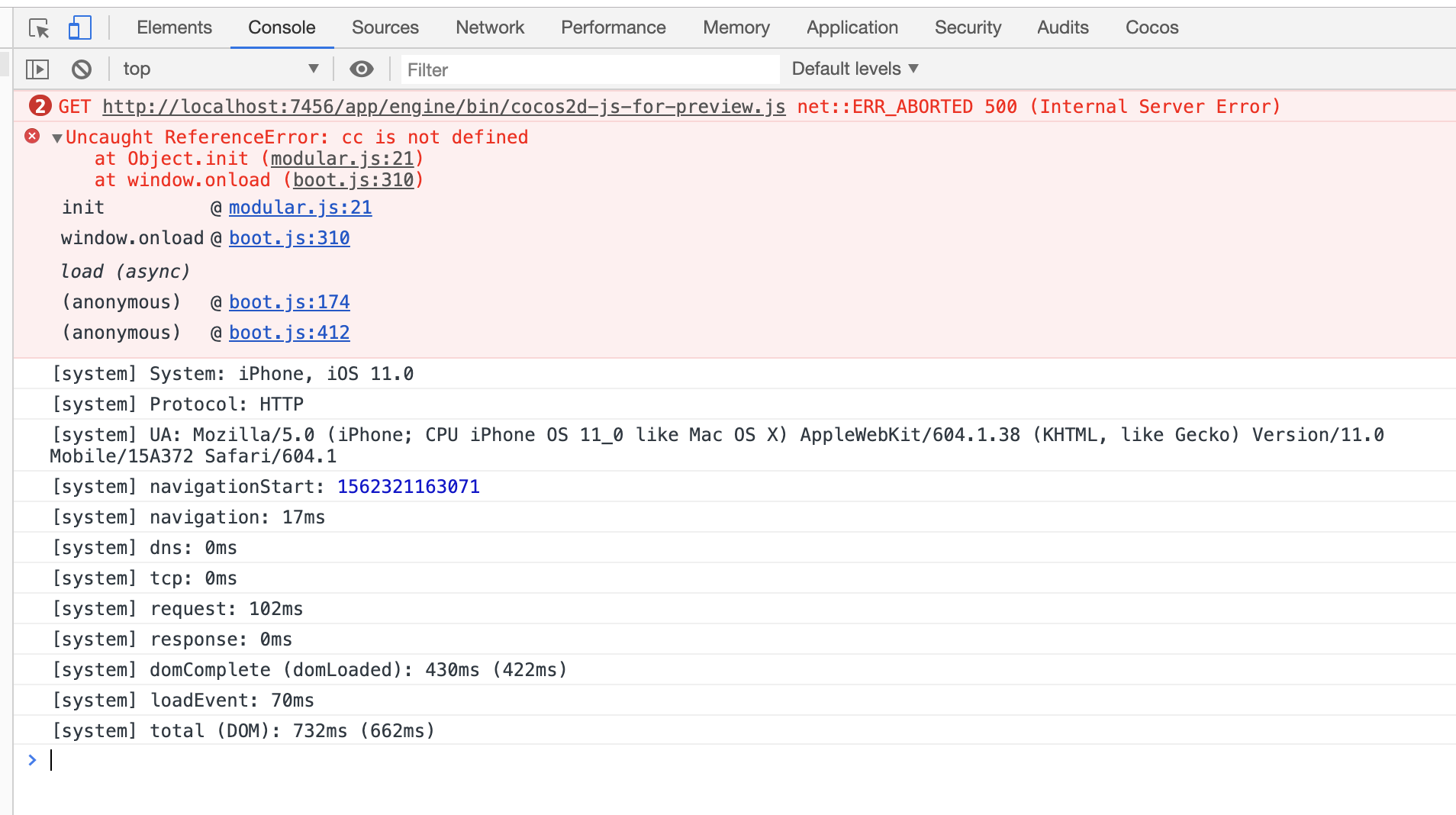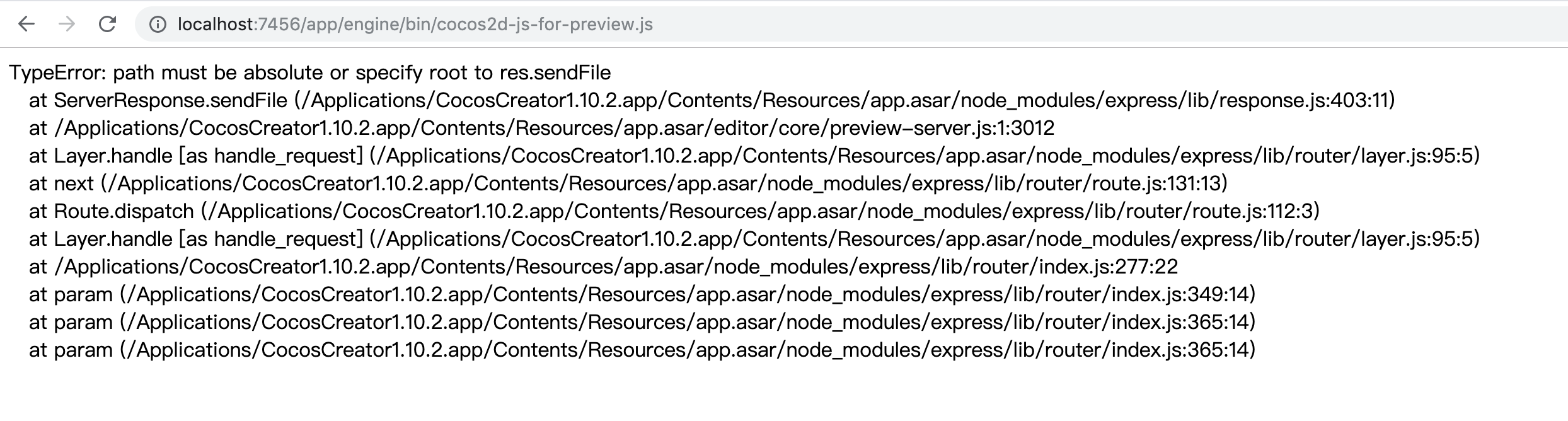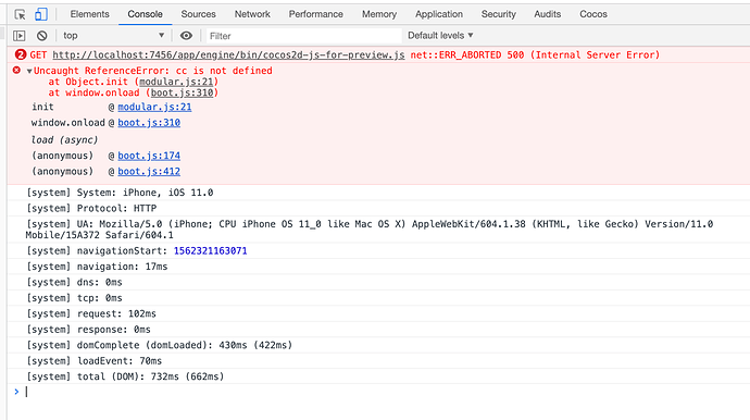 走完之后,开始在creator编辑器中配置自定义engine路径,配置好了,问题来了,运行出错,找不到cc,因为好像加载不了cocos2d-js-for-preview.js,看下图: