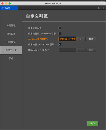 「项目->项目设置->自定义引擎->javascript引擎路径」