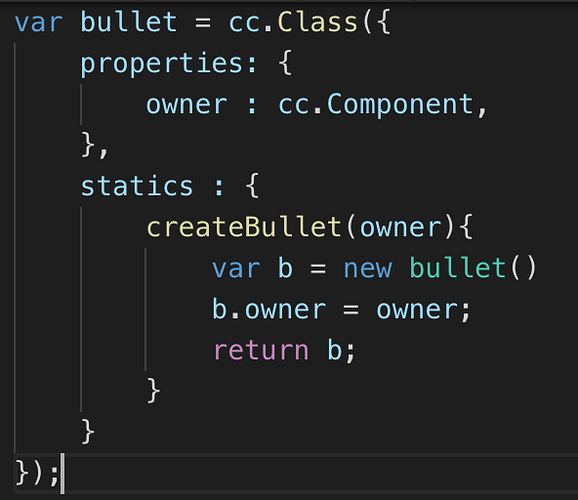properties: { owner : null, }, statics : { createBullet(owner){ var b = new bullet() b.owner = owner; return b; } }});