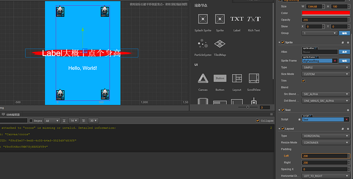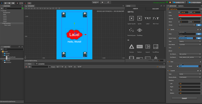 - 重现方式:本来想做一个小文字提示框,我创建了背景spirte节点,图片是背景,然后在节点中创建了lable节点子类,给sprite添加了layout组件,选择container模式,设置好了padding 100 ,(这样是为了做一个弹窗打下根据文字长度自动变大效果)…然后我用代码控制让sprite节点缩小到0.5,计划做个弹出效果,然后,发现layout失效了图片一点不符合预期