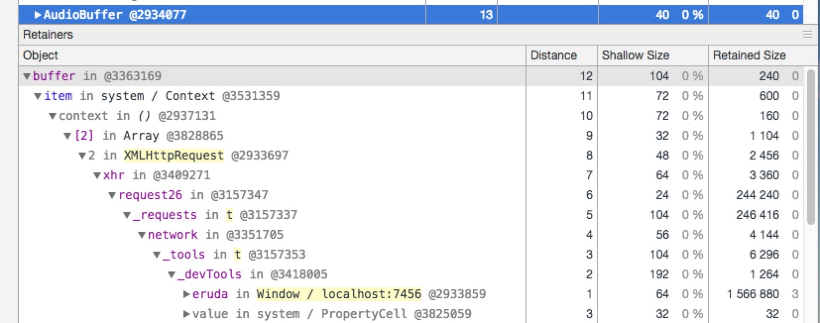 调试工具 eruda 和浏览器会自动缓存 http 以及 audio buffer,并且要驻留一段时间才能够进行回收。这个也会造成内存暴涨,不过不使用大概几分钟就就会恢复到正常的内存水平。