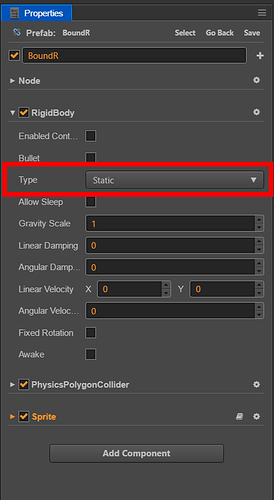 这个bound预制体是一个竖直的白色长条,是用于阻挡主角移动的,它挂载了刚体组件,以及物理碰撞组件。