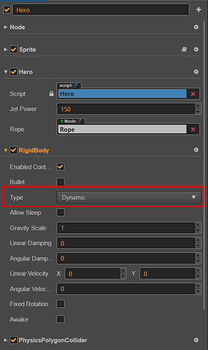 我们的主角hero也是挂载了刚体组件的,刚体类型是Dynamic: