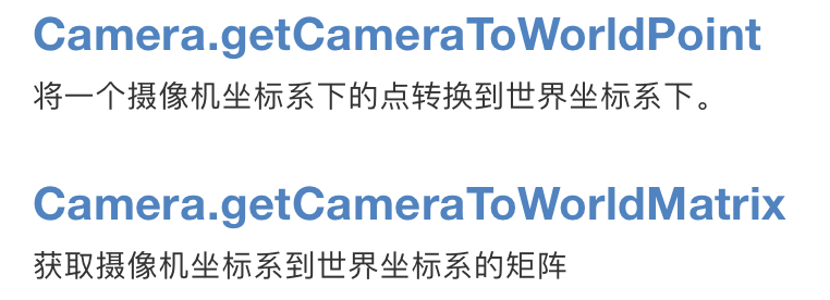 如果你要获得某个坐标或是节点在Camera下的坐标是多少,可以参考使用下面的api
