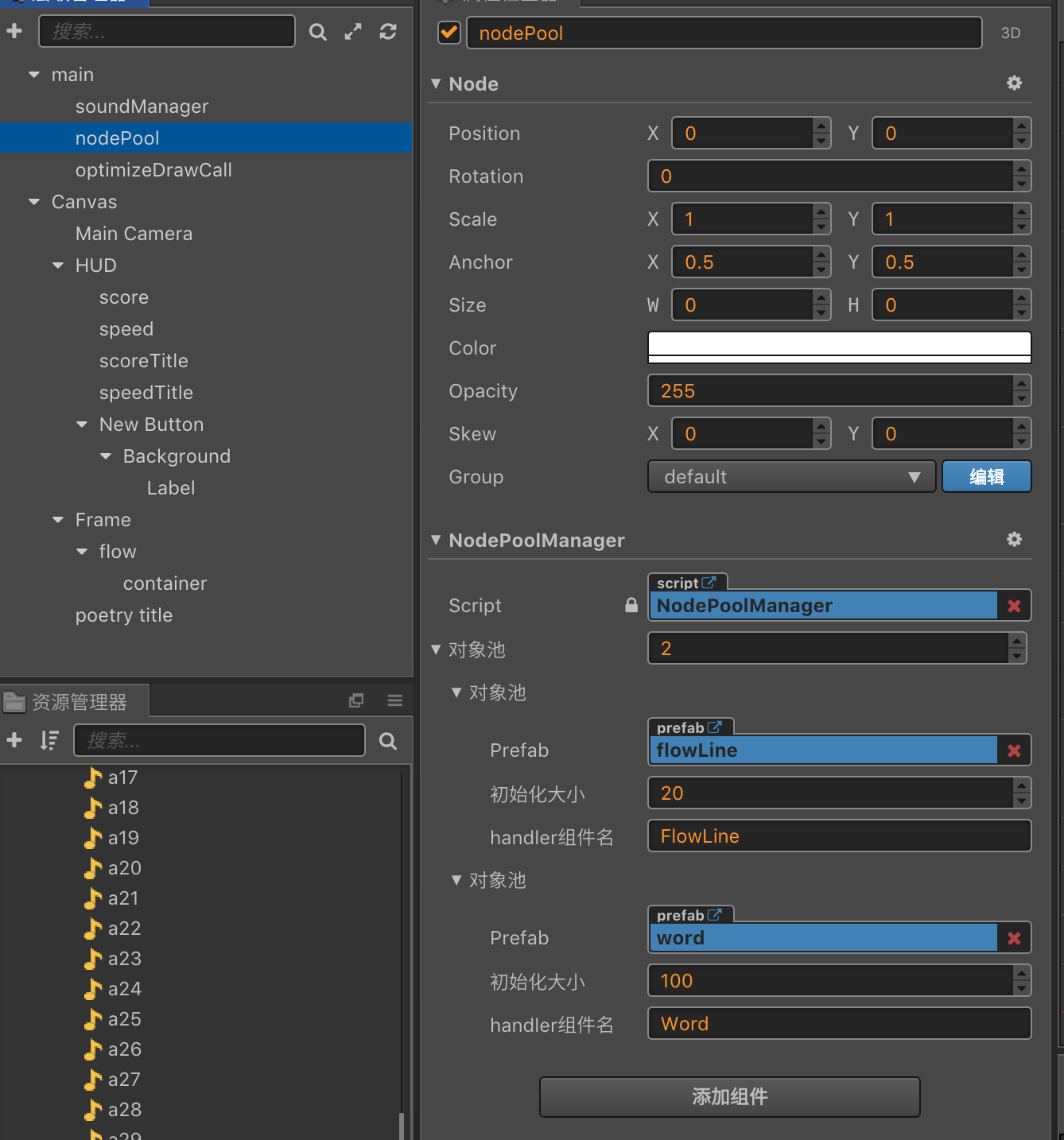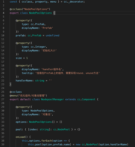 我写了一个对象池管理组件,其中一个参数就应该配置此prefab上挂的实现reuse、unuse方法的组件,姑且称为PoolImpl。