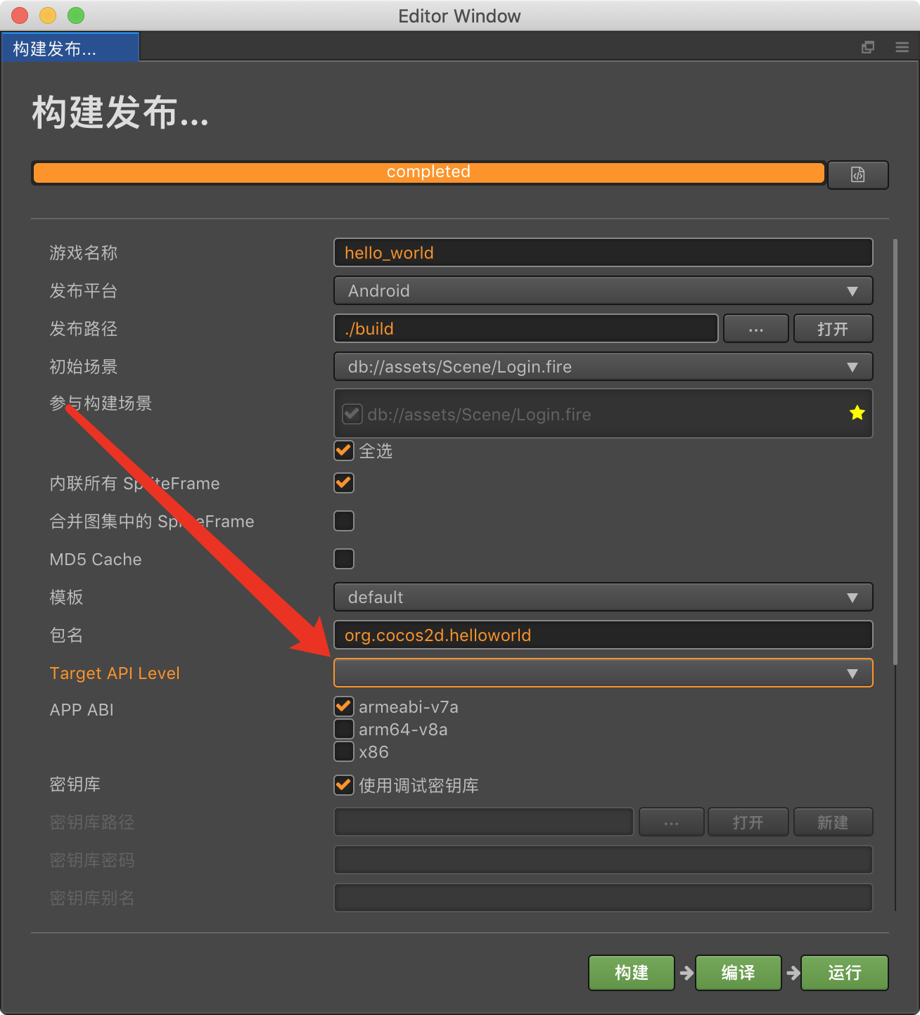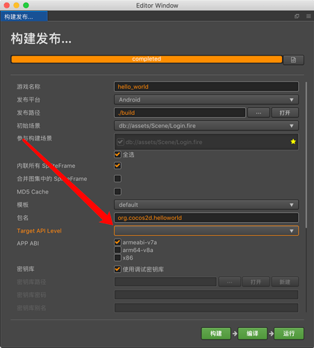 在编译时 android-sdk 里面有多个API-LEVEL 构建发布界面上显示的Tartget API Level 只显示了最高的等级,并且下拉列表无用,