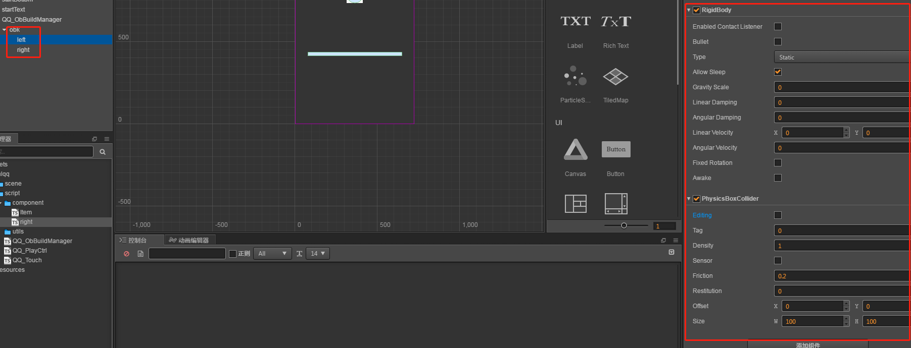 使用物理引擎,在场景中创建了一个节点,包含两个子节点:left和right ,作为预制节点用于创建对象池。(简单起见没有做预制体)