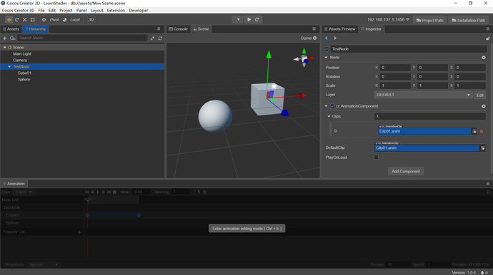 再简单说明下,这个场景中加了一个节点TestNode,下面两个子节点,TestNode上加了一个Anim组件,然后做了个简单的Cilp