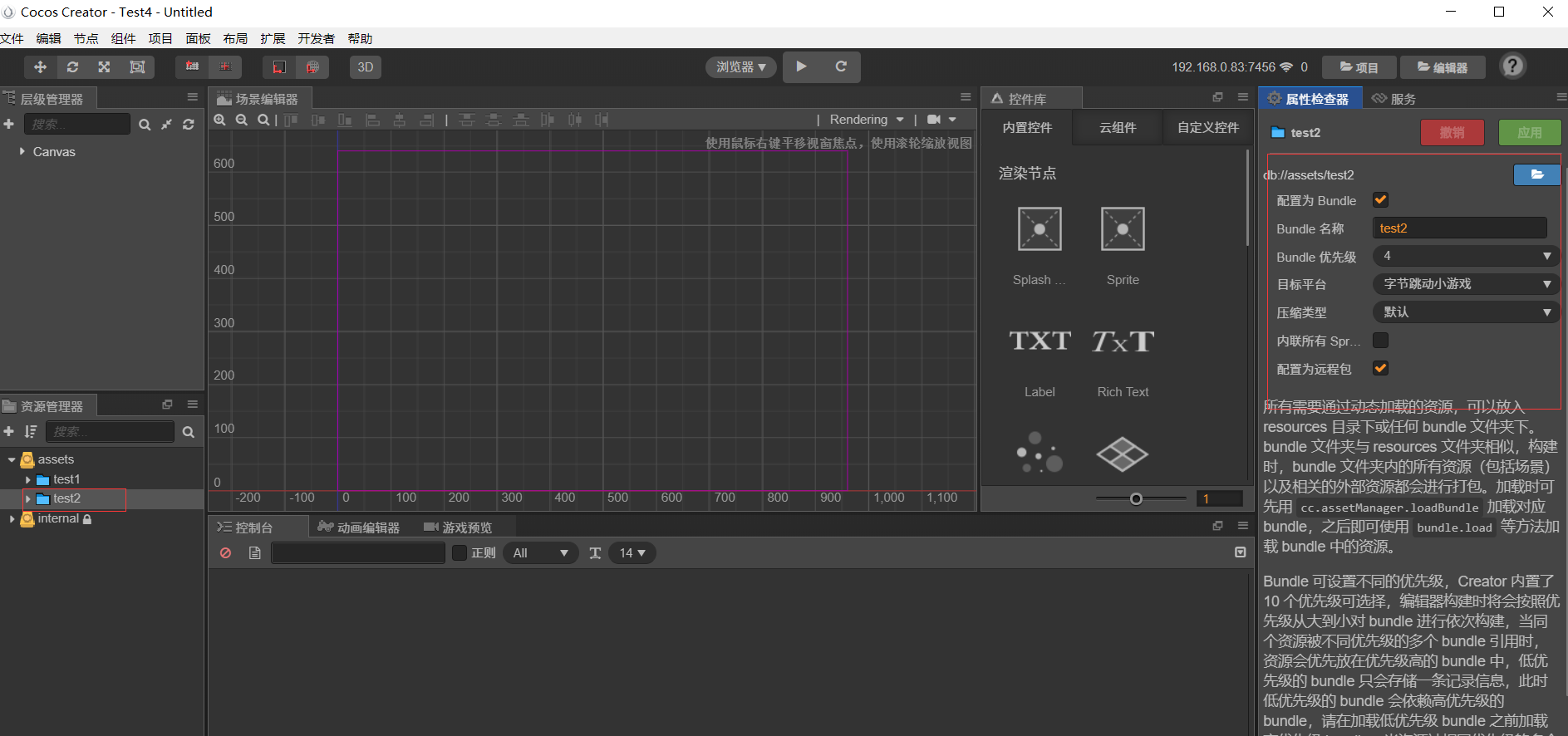 cc.assetManager.loadBundle("test2", (err, res) => {