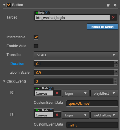 weChatLogin: function (event, sceneName) { cc.log(sceneName) this.node.runAction(cc.sequence(cc.delayTime(0.3), cc.callFunc(function () { cc.director.loadScene(sceneName) }))); }, playEffect: function (event, audioName) { cc.log(audioName) if (this.effectOn) { let audio = cc.url.raw("resources/audio/" + audioName) cc.audioEngine.play(audio, false, 1) } },