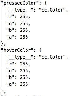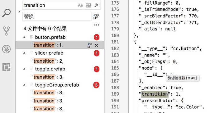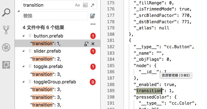 将整个prefab文件夹拖进vs code, 搜索transition,选中button.prefab,修改transition值,取值可以有0,1,2,3对应编辑器的4个状态,修改对应状态的值,保存后可以在编辑器显示,这gif上传后怎么这么不清晰,将就着看下吧