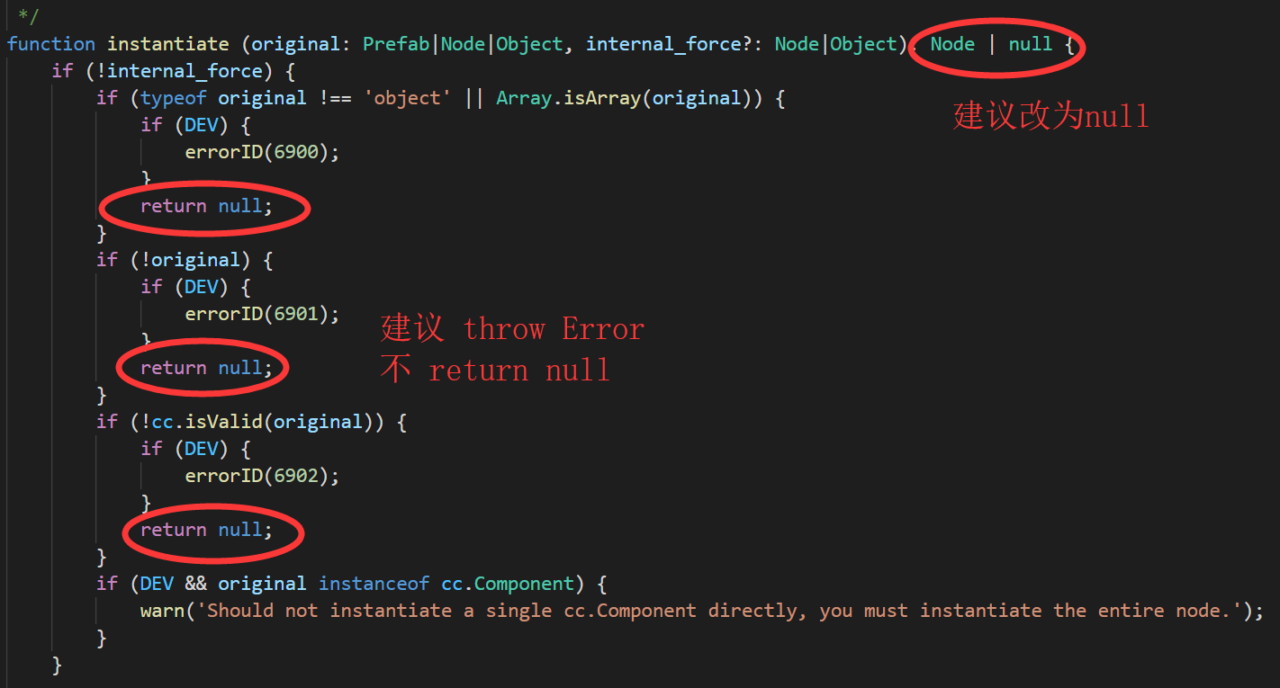 instantiate中的异常流程,直接throw Error,而不是返回null (开发者想处理就try catch,不想处理就让错误暴露出来)