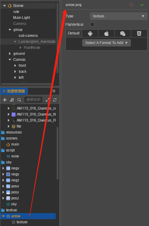 你的 arrow 资源需要设置为 sprite frame 类型才可以拖到这个选项中