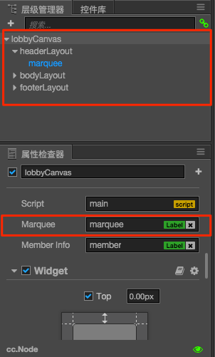 如下图 我在 lobbyCanvas 的脚本中定义 marquee 属性