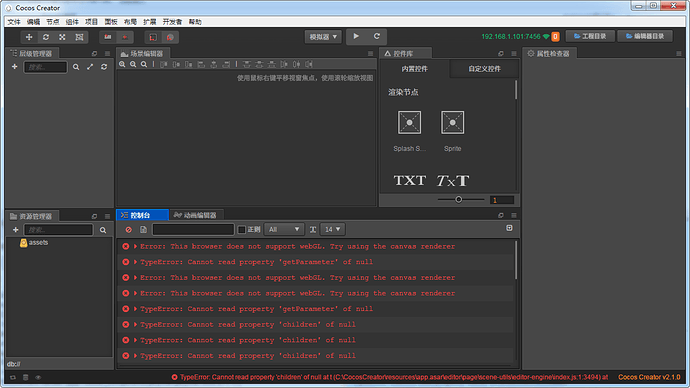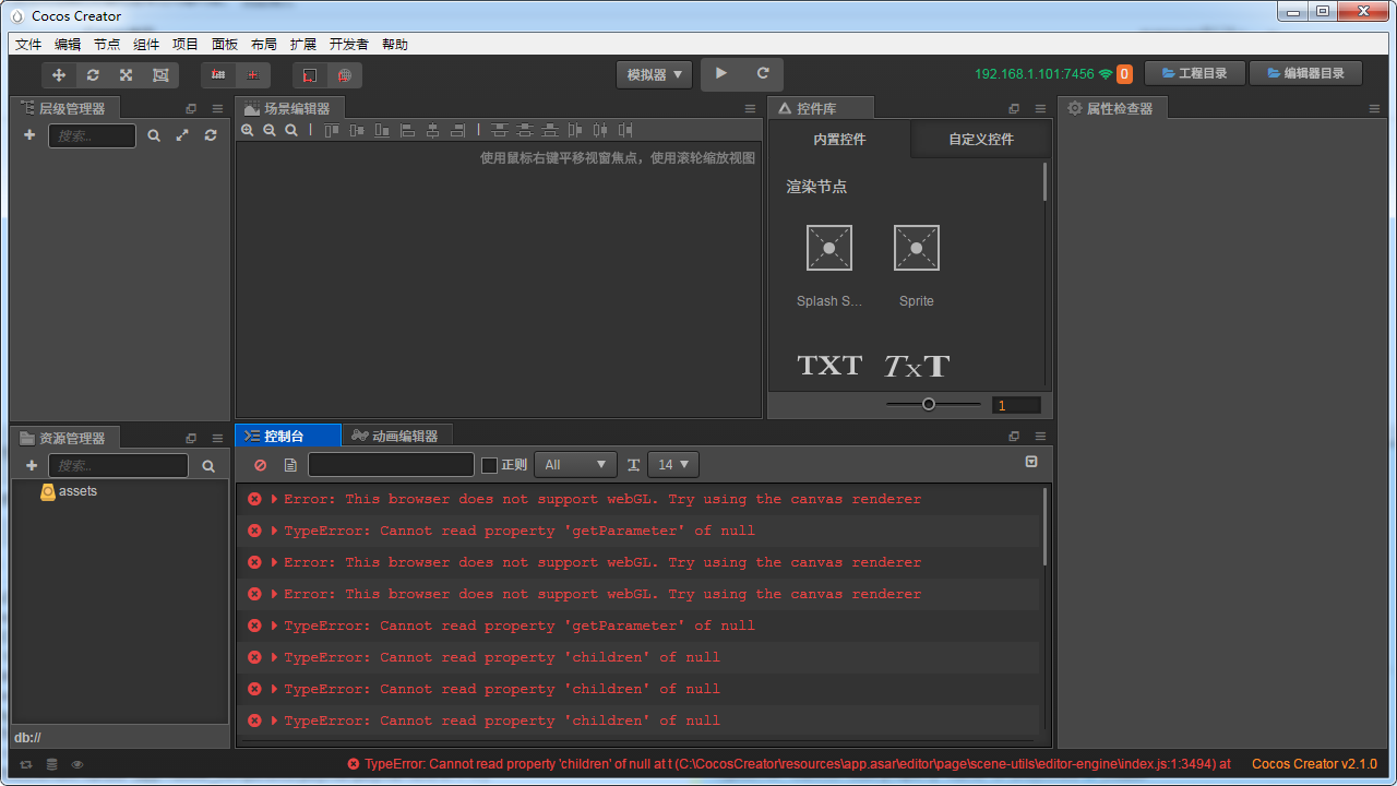 用的是cocos creator v2.1版,以前还正常,今天打开变这样了,创建一个空白新项目的时候,没有canvas,报了下面的错误: