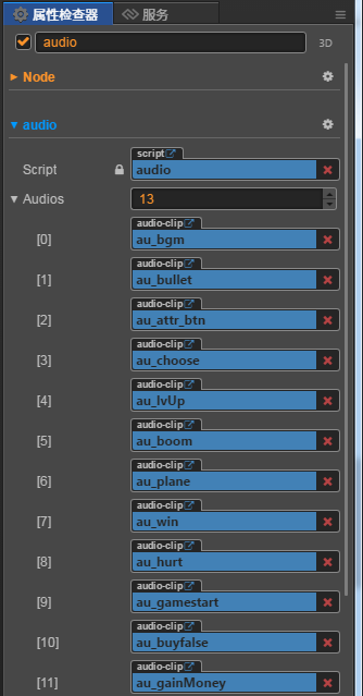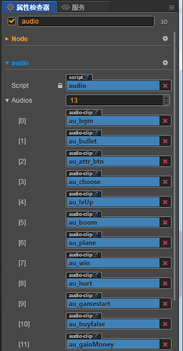 弄一个空节点,JS脚本大概就是下面这样,你有切换场景就把他弄成常驻节点,然后去属性编辑器里给audios数组填上长度,挂上音频文件