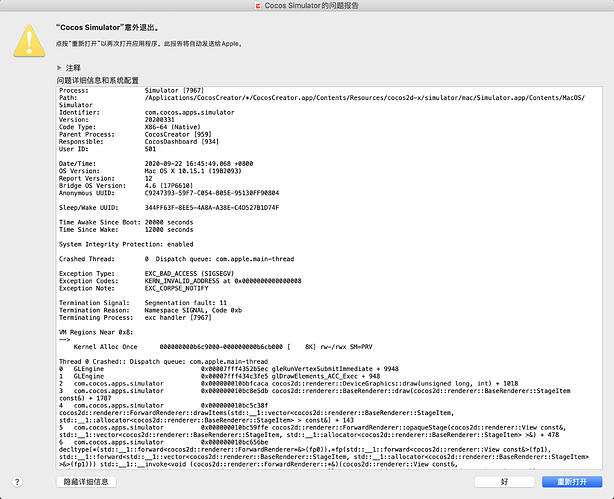 4 com.cocos.apps.simulator 0x000000010bc5c38f cocos2d::renderer::ForwardRenderer::drawItems(std::__1::vector<cocos2d::renderer::BaseRenderer::StageItem, std::__1::allocatorcocos2d::renderer::BaseRenderer::StageItem > const&) + 143