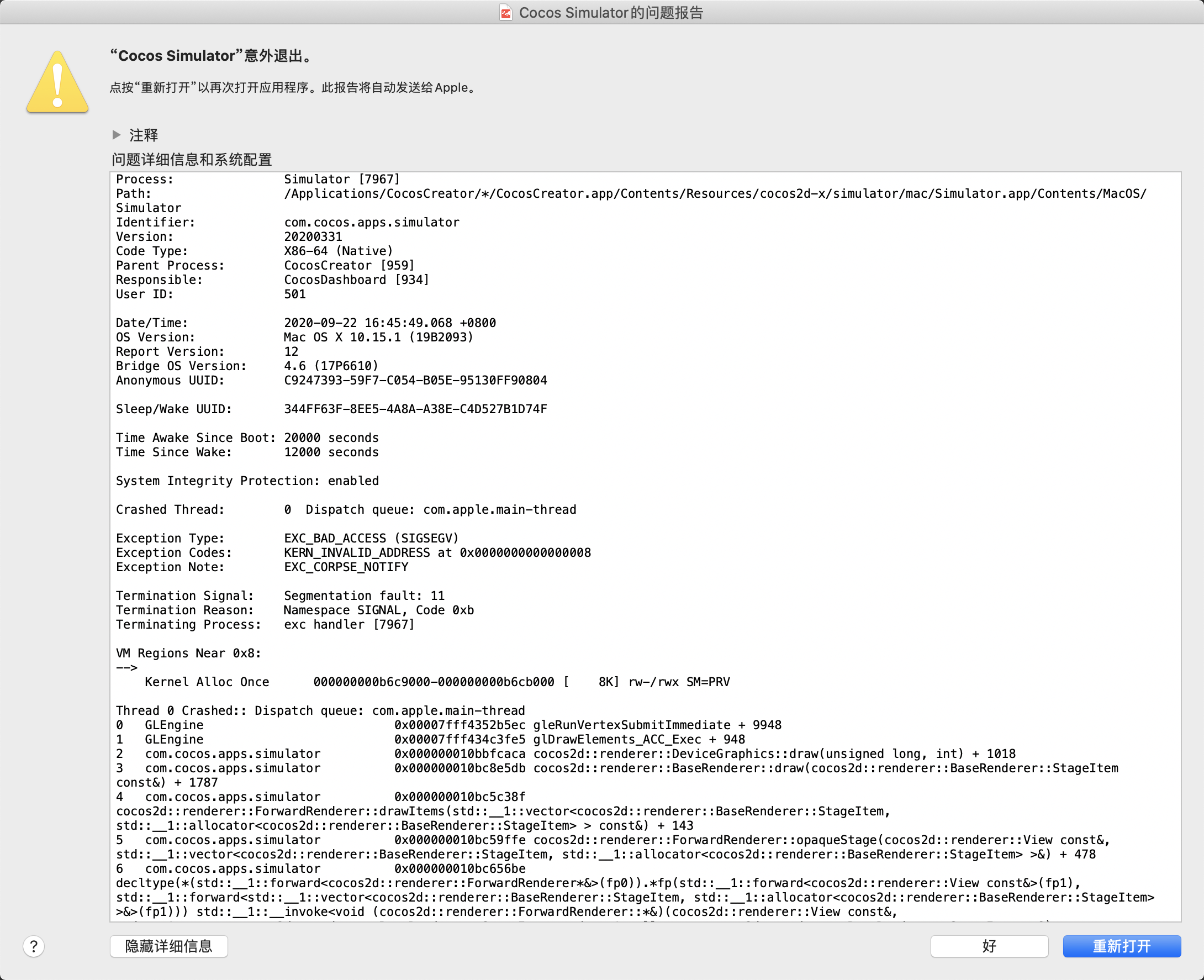 3 com.cocos.apps.simulator 0x000000010bc8e5db cocos2d::renderer::BaseRenderer::draw(cocos2d::renderer::BaseRenderer::StageItem const&) + 1787