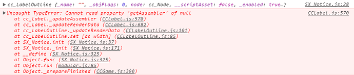 使用脚本创建节点并添加 cc.label 和 cc.labelOutline 组件,在设置 cc.labelOutline组件的width属性时出现bug。出现错误: