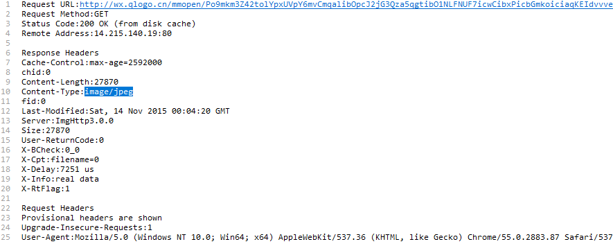 熊猫大大说是因为微信头像的地址不带后缀名所致,所以loader无法判断文件类型,然后我抓包看下了,内容如下: