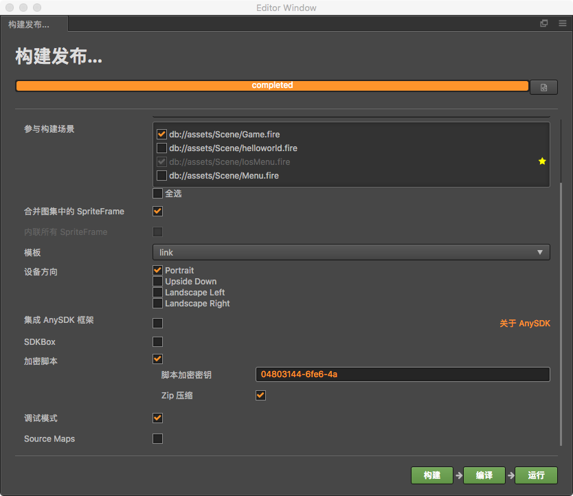 脚本加密先去掉试下,要做发布版的时候再去掉调试模式和勾选加密脚本