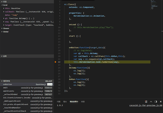 点击button进入this.HeroAnimation.node.runAction(seq);这一句的时候就崩了!崩了!崩了!