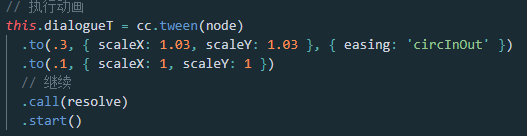 这是一个节点的显示动画,我希望点击屏幕,让这个动画立即执行完成,这个好说,主要是在call中有个resolve参数,这个参数的promise中的,他决定了当前动画执行完毕,能够进行后续操作,而我的事件是绑定在外部的,这个事件处理函数可以拿到this.dialogueT,让它暂停,我再手动修改节点scale,但是.call不会执行,resolve也不会触发,这个异步任务就会一直等待,请问有什么好的处理方式吗
