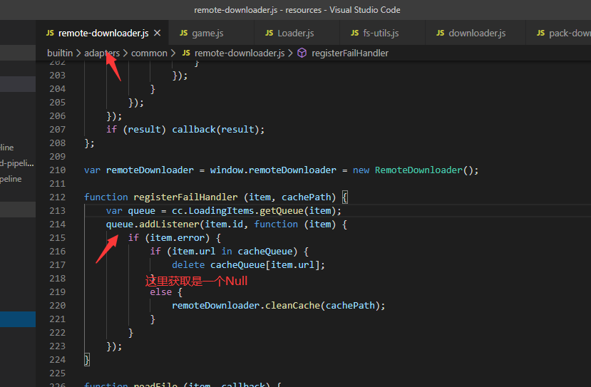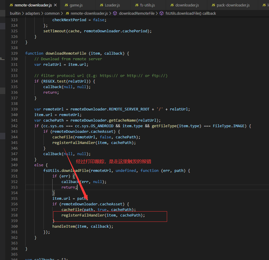 先说明一下问题:资源加载的时候,发现有时候会卡主,然后就进console发现了remote-downloader.js这个脚本内部报错了,,而且这个问题的触发我调试发现,是在,第一次进小游戏没有缓存的情况下很容易出现